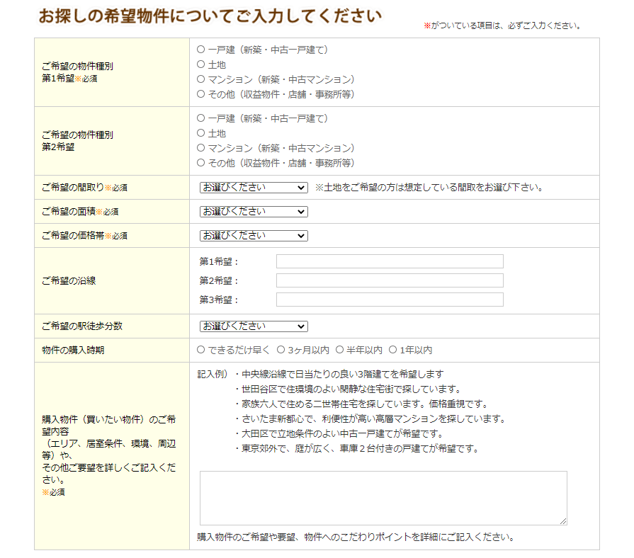 購入物件のご希望内容は、できるだけたくさん書くようにすると希望する内容の情報が手に入ります。
