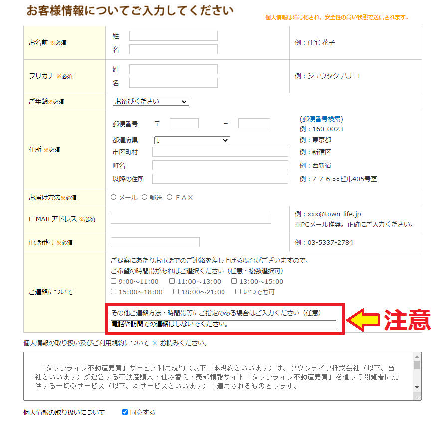 ご連絡についての欄に「電話や訪問での連絡はしないでください」と書き込むと、メールでやり取りで連絡できるので気軽です。