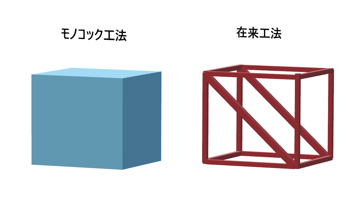 モノコック工法が6面の箱型で構成されるのに対して、在来工法工法は、縦材と横材と斜め材で構成されます。